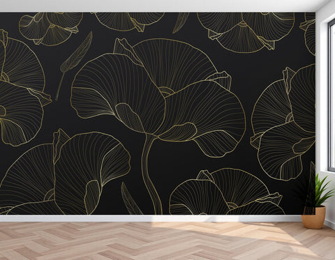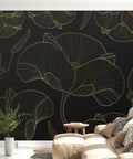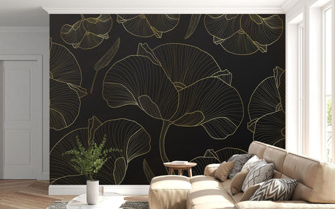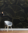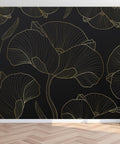 Black and Gold Ginkgo Leaf Line Art Flower Wall Mural
