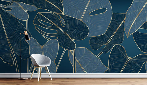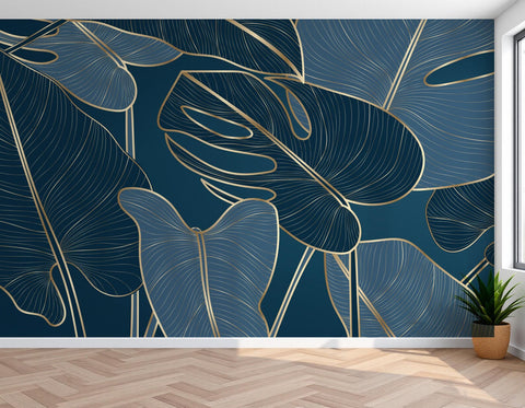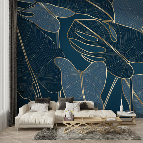 Transform your space with this bold dark blue wall mural featuring oversized tropical leaves outlined in metallic gold. The clean line art style blends modern elegance with a botanical vibe, making it ideal for feature walls in living rooms, bedrooms, or creative studios. The lush monstera and banana leaf design adds depth without overwhelming the space. Printed with high-resolution precision for a crisp, luxurious look. Easy to install and brings a sophisticated, natural touch to any interior.