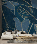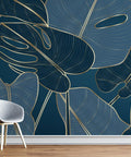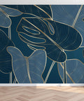Dark Blue and Gold Tropical Leaf Wall Mural with Monstera and Banana Leaf Line Art