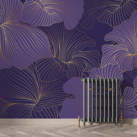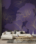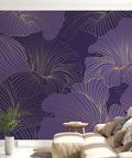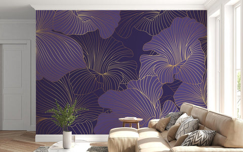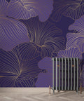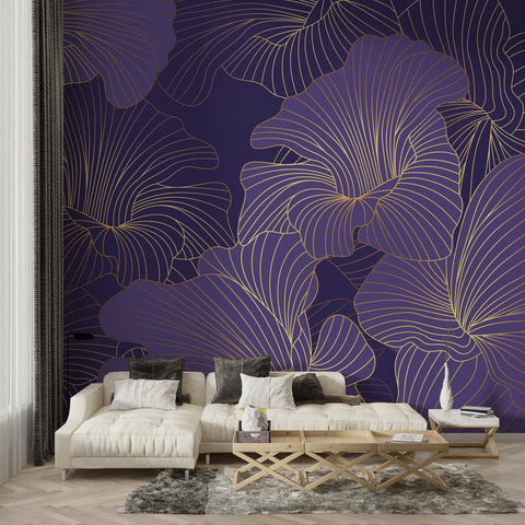 Add a touch of elegance with this deep purple floral wall mural featuring abstract petals outlined in metallic gold. The flowing line art is inspired by ginkgo leaves, creating a harmonious blend of nature and luxury. Ideal for accent walls in bedrooms, boutiques, or salons, this mural transforms any space into a modern sanctuary. Printed with fine detail for a clean, sophisticated look. Peel-and-stick or paste options available for easy installation. A bold design that brings warmth and artistic flair to interiors.