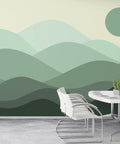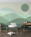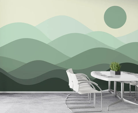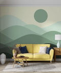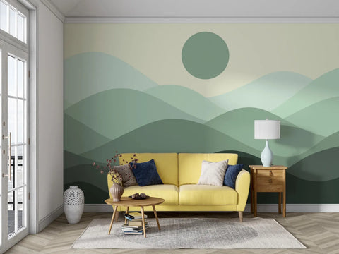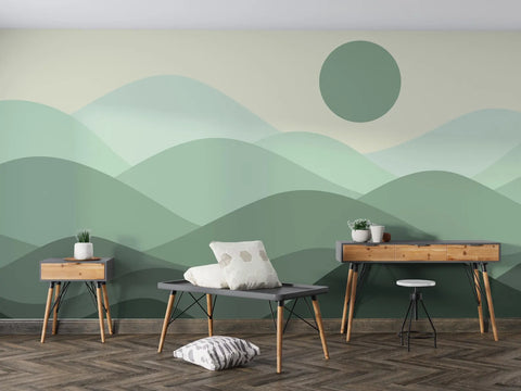 Layered green hills and a soft round sun create a calming mountain scene with abstract simplicity. This mural brings a sense of quiet nature without heavy detail, making it suitable for any modern space. The tones are muted and balanced, allowing your room to feel open and peaceful. It's a subtle yet powerful way to introduce a nature-inspired visual into your home.
