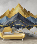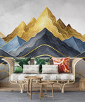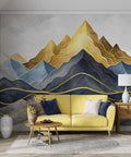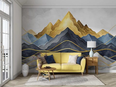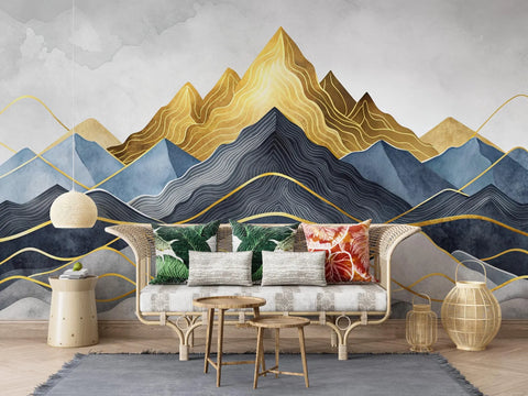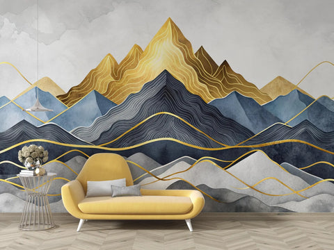 This elegant wallpaper features a layered abstract mountain scene in rich watercolor blues, greys, and deep gold tones. Delicate golden linework enhances the peaks, creating a luxurious and modern visual impact. Ideal for accent walls in living rooms, bedrooms, or creative studios, it adds depth and sophistication to any interior. A ideal choice for those seeking bold art with a refined, artistic flair.
