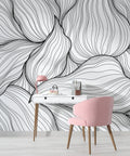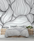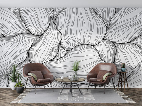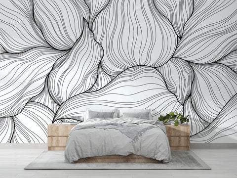 This black and white wallpaper features an abstract, flowing leaf pattern made of delicate hand-drawn lines, creating a serene and stylish atmosphere. Perfect for modern and minimalist interiors, it brings a botanical elegance to your space without overwhelming it. Ideal for accent walls, bedrooms, studios, or offices, this design adds motion and sophistication to any room. Available in peel and stick or traditional wallpaper options. Custom sizing ensures fit for your wall dimensions.