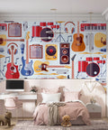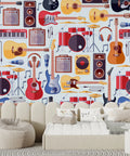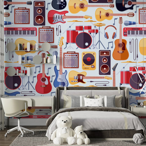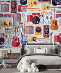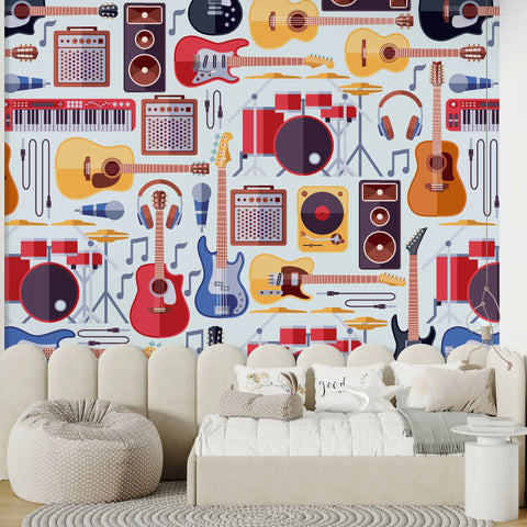 Bring a vibrant musical atmosphere to your space with this Musical Instruments Pattern Wallpaper. Showcasing detailed illustrations of guitars, drums, keyboards, and more, this mural adds a creative and rhythmic touch to any room. Ideal for music lovers, studios, or creative areas, it features high-quality materials for durability and style.
