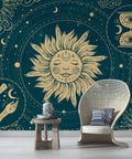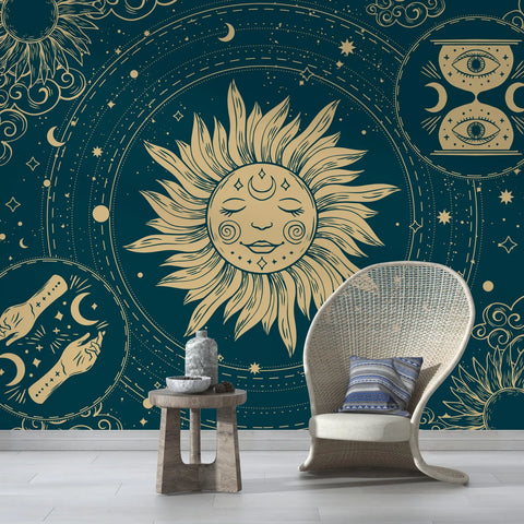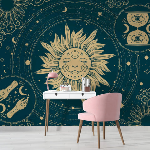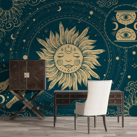 This celestial wallpaper features a mystical sun, moon, stars, and occult-inspired elements on a deep teal background with golden line work. It brings an enchanting, cosmic energy to any room — ideal for meditation spaces, bohemian living rooms, or spiritual bedrooms. Designed for those who love astrology, boho, or esoteric symbolism, it offers bold visual impact and a mystical vibe. Available in both peel-and-stick and traditional wallpaper options for easy installation.