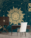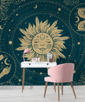 Mystical Sun Boho Wallpaper – Dark Blue and Gold Celestial Mural with Moon Phases and Stars
