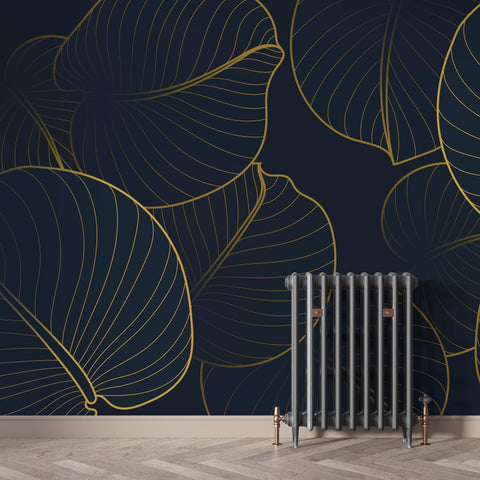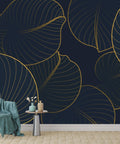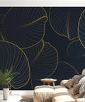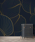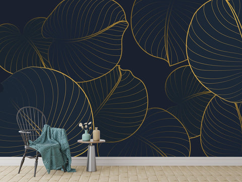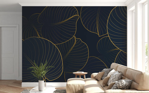 Navy Blue Wall Mural with Gold Tropical Leaves